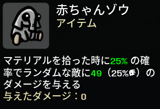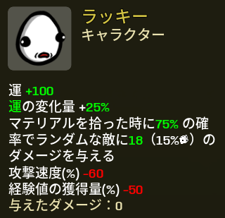 ラッキーは先ほど説明した特徴に加え、マテリアルを拾った際に75%の確率でランダムな敵にダメージを与えます。