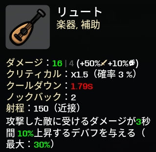 リュートは運でもダメージがスケールしますが、近接ダメージでのスケールの方が数値としては大きいので序盤は運よりも近接ダメージの方を見たほうがダメージの伸びはいいです。