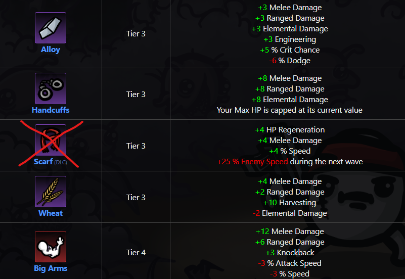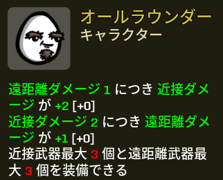 つまり、このパッシブは近接武器3個と遠距離武器3個を持たせる代わりに、どちらかのステータスを取ってももう片方が本来得られるステータスをあげますよっていう作りになってます。
